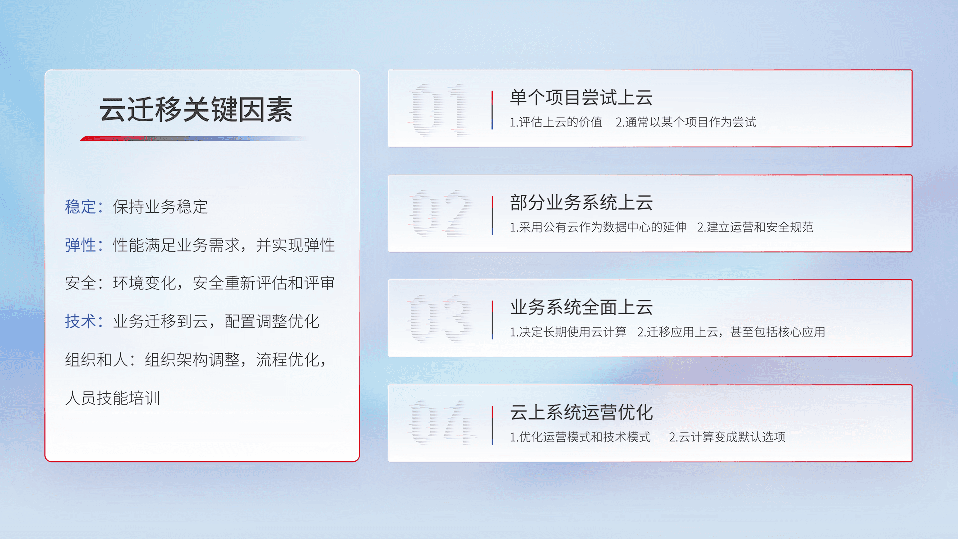 结合实际业务,,从规划设计、、、云平台选型、、、云原生改造、、、、数据迁移、、、集成交付,,,,迁移全过程为客户识别最佳上云路径,,,,做好风险识别管理,,设计网络架构、、身份权限、、、、安全审计合规、、、、操作审计、、日志审计、、、、监控告警策略、、、、多站点容灾设计等,,对云上基础设施进行整体规划,,,,提升IT治理水平,,,以满足弹性、、、高可用、、高性能的需求。。。