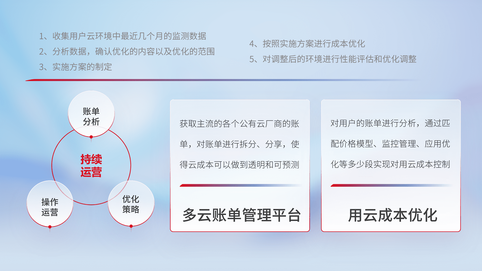 通过多云纳管,,以统一的资源数据模型把客户的云资源进行抽象和封装,,进而实现对多云资源的统一操作,,,,保障云资源管理的可靠性、、、、稳定性与可用性。。。。量身定制化运维内容,,配置、、开发运维、、补丁管理、、、备份、、监控、、、、认证和访问管理、、、审计和日常巡检等,,保障在用云过程中的可靠度,,稳定度以及高可用率。。。。